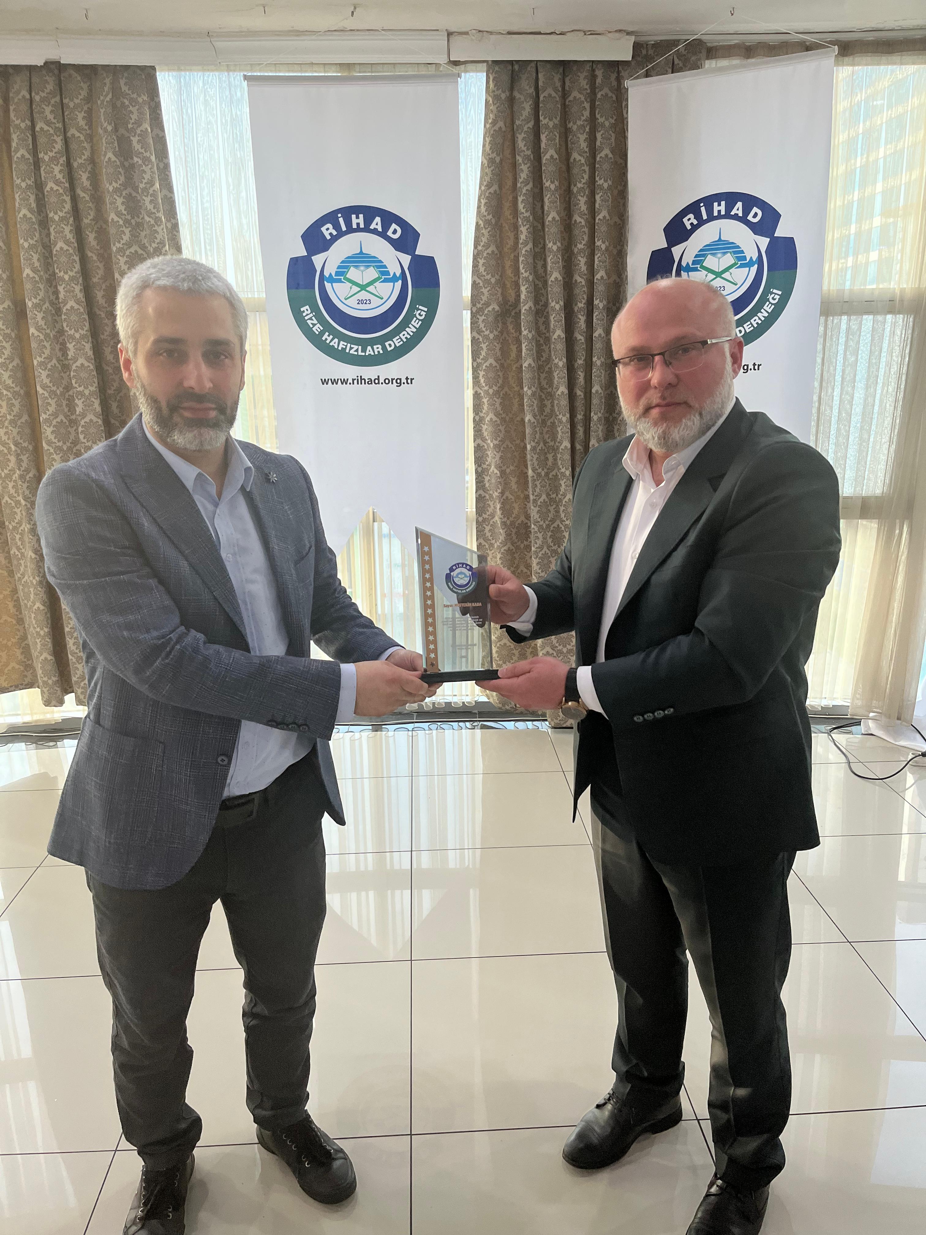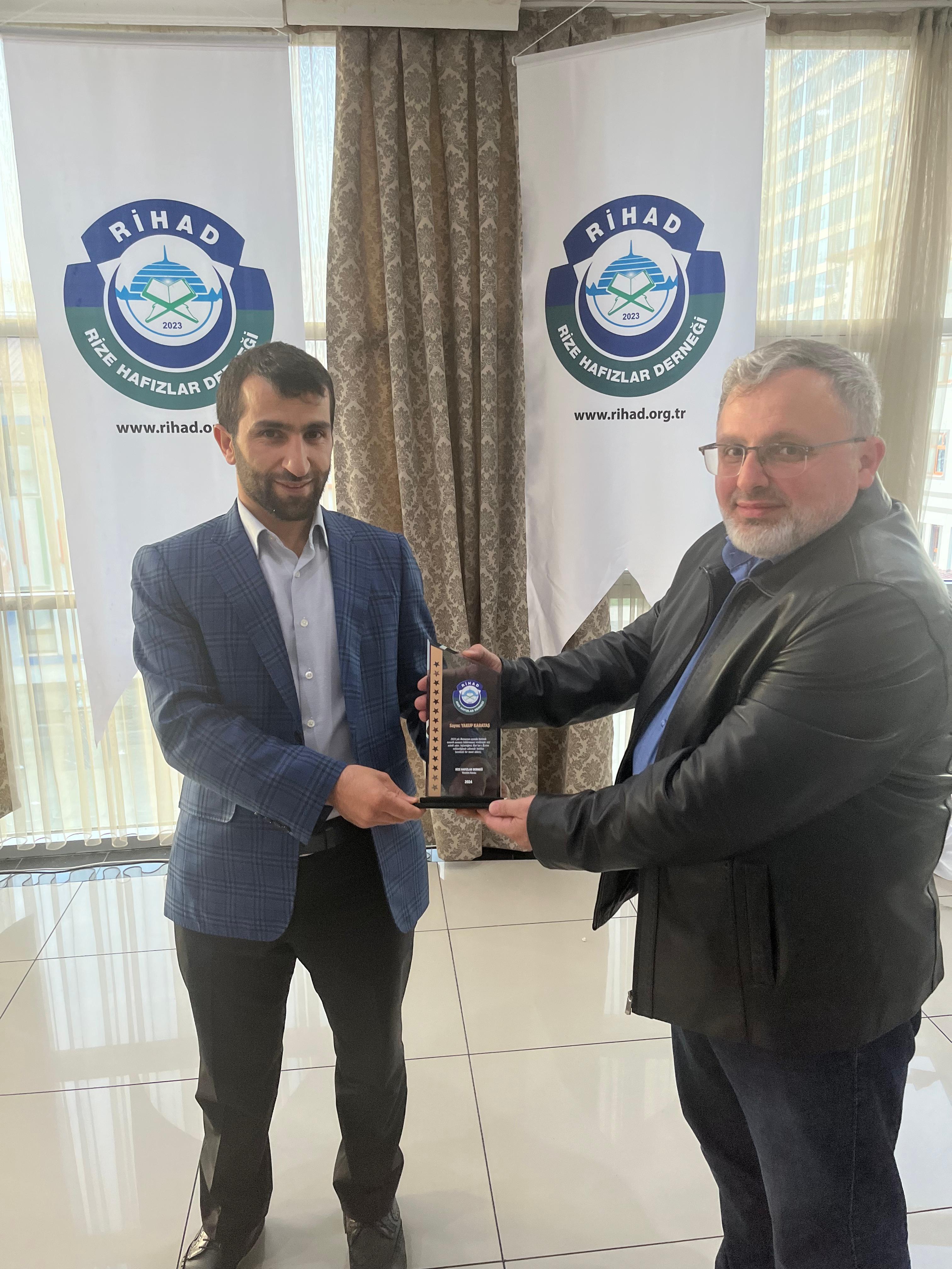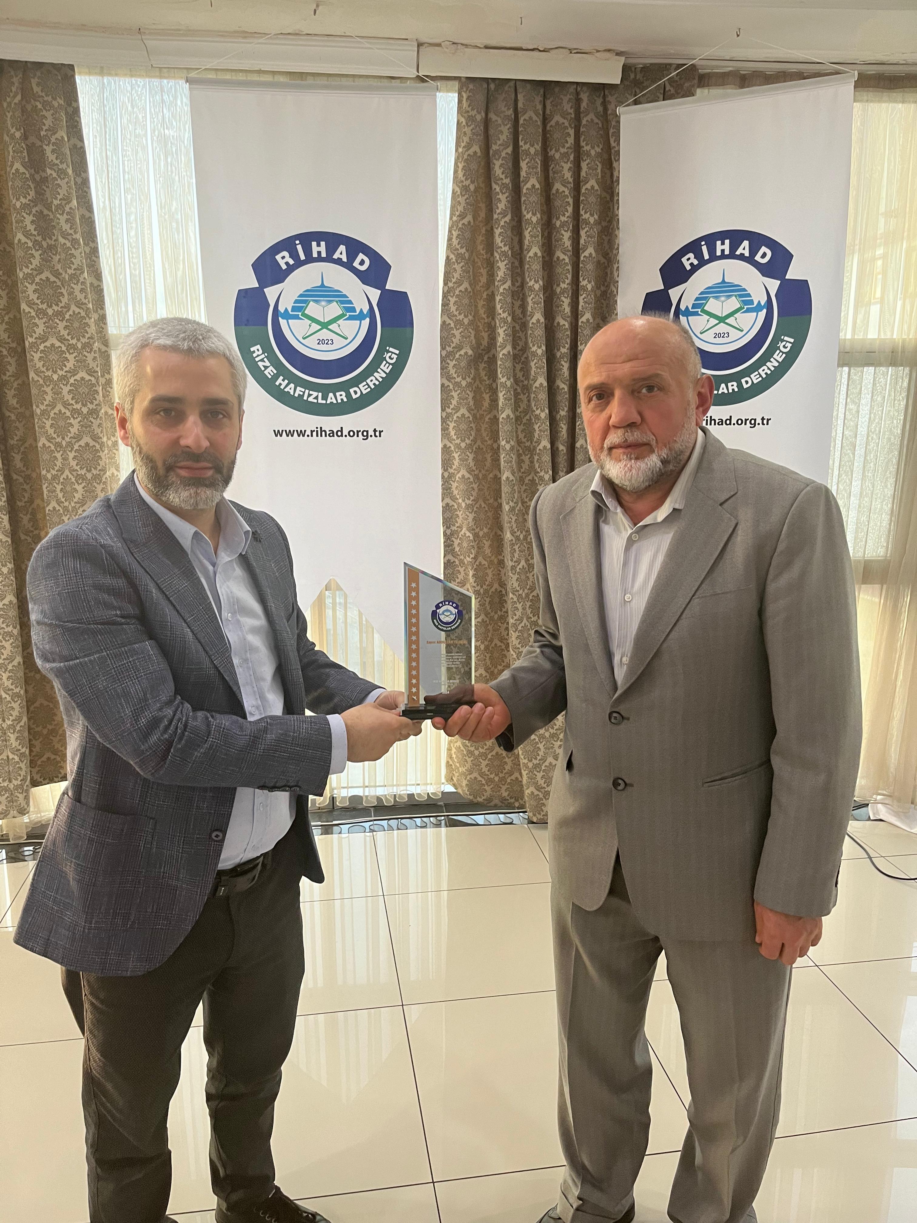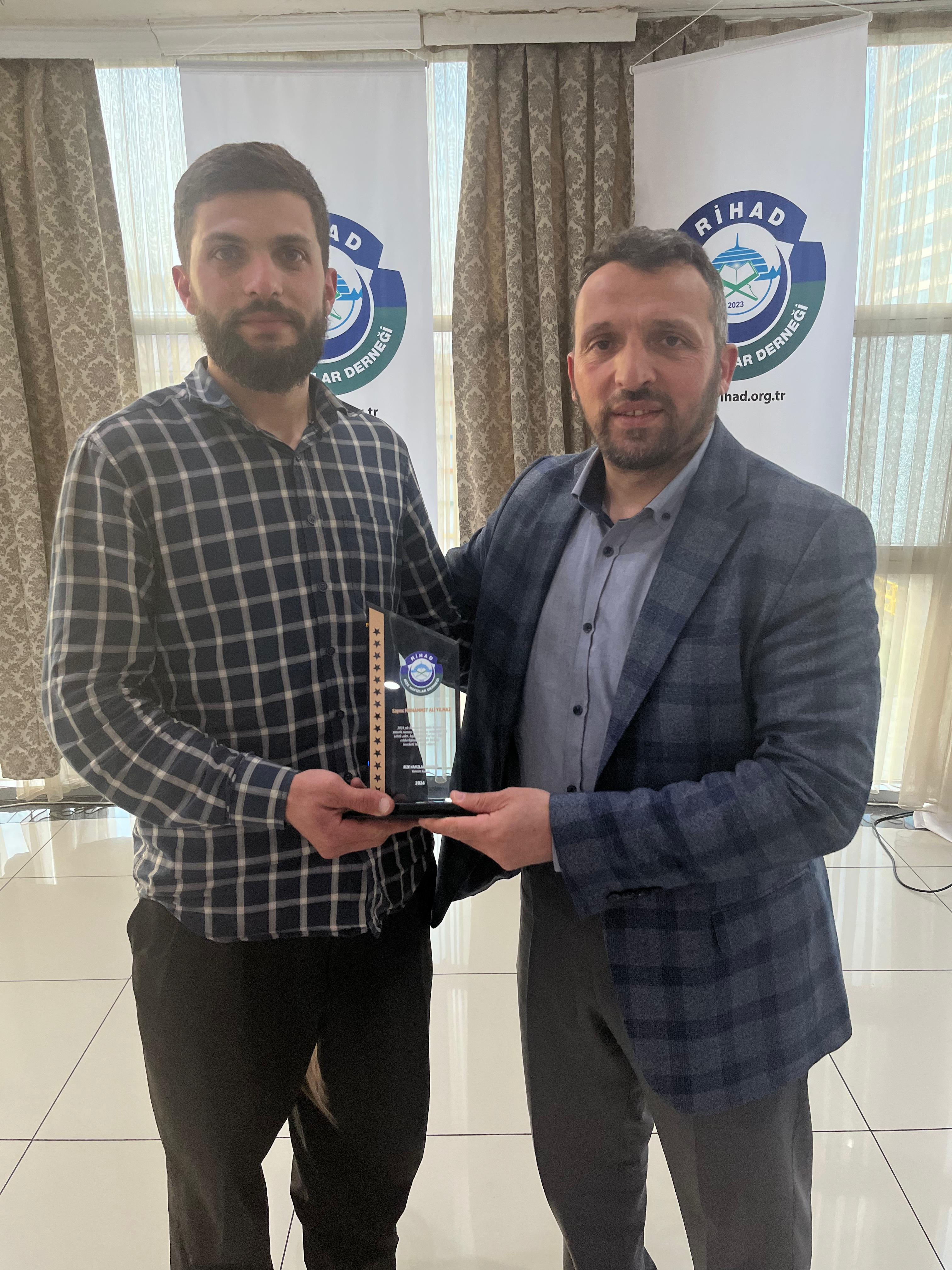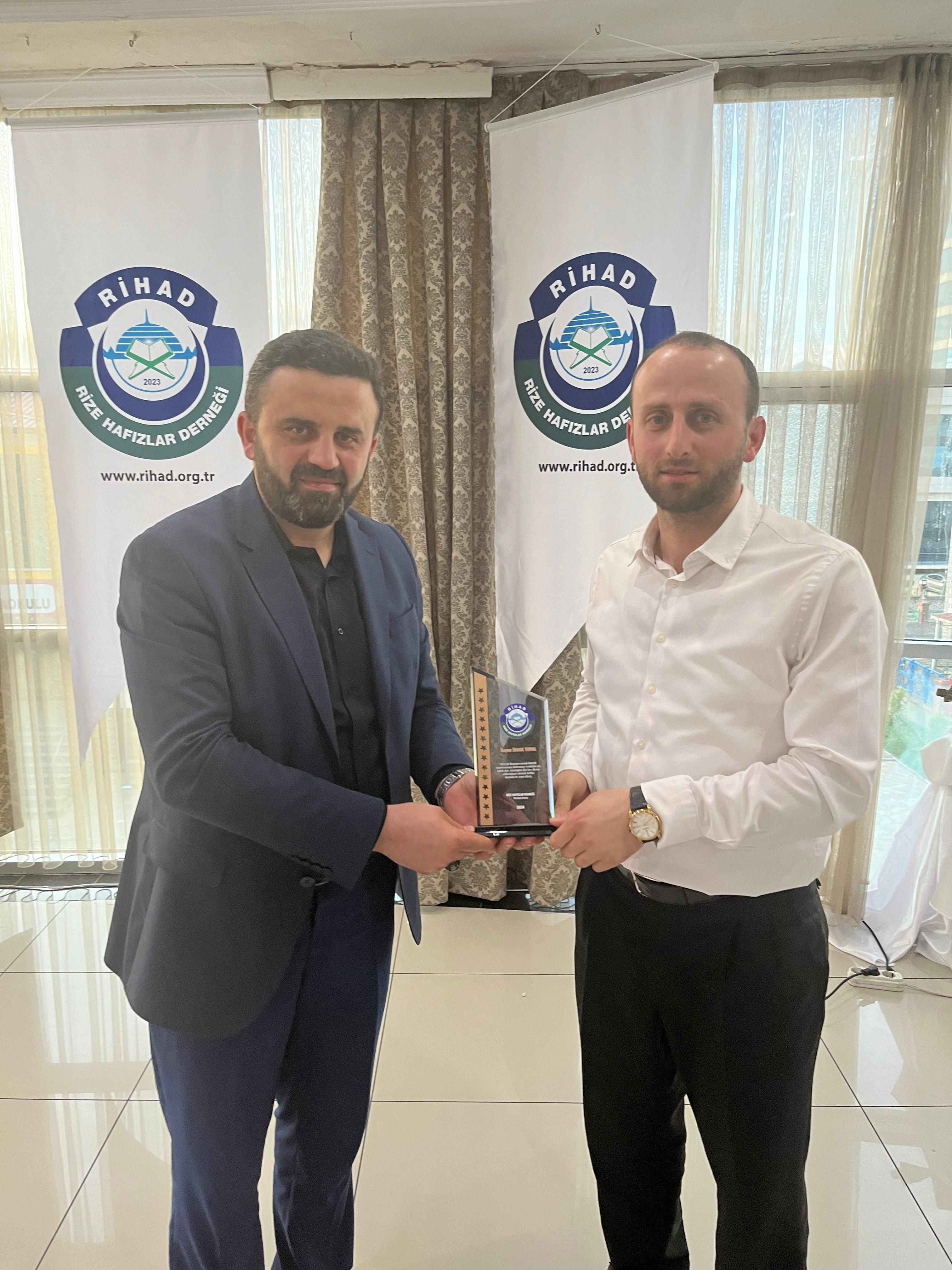 Rize Hafızlar Derneği (RİHAD) tarafından, Rize Merkez ve İlçelerinde bu yıl Ramazan ayında belirli Camilerde Hatimle Teravih Namazı kıldıran İlçe Müftüleri, Kur’an Kursu Öğreticileri, İmam Hatipler ve İmam Hatip Lisesi Hafız Öğrencilerine RİHAD Yönetim Kurulu üyeleri tarafından Plaket takdim edildi.