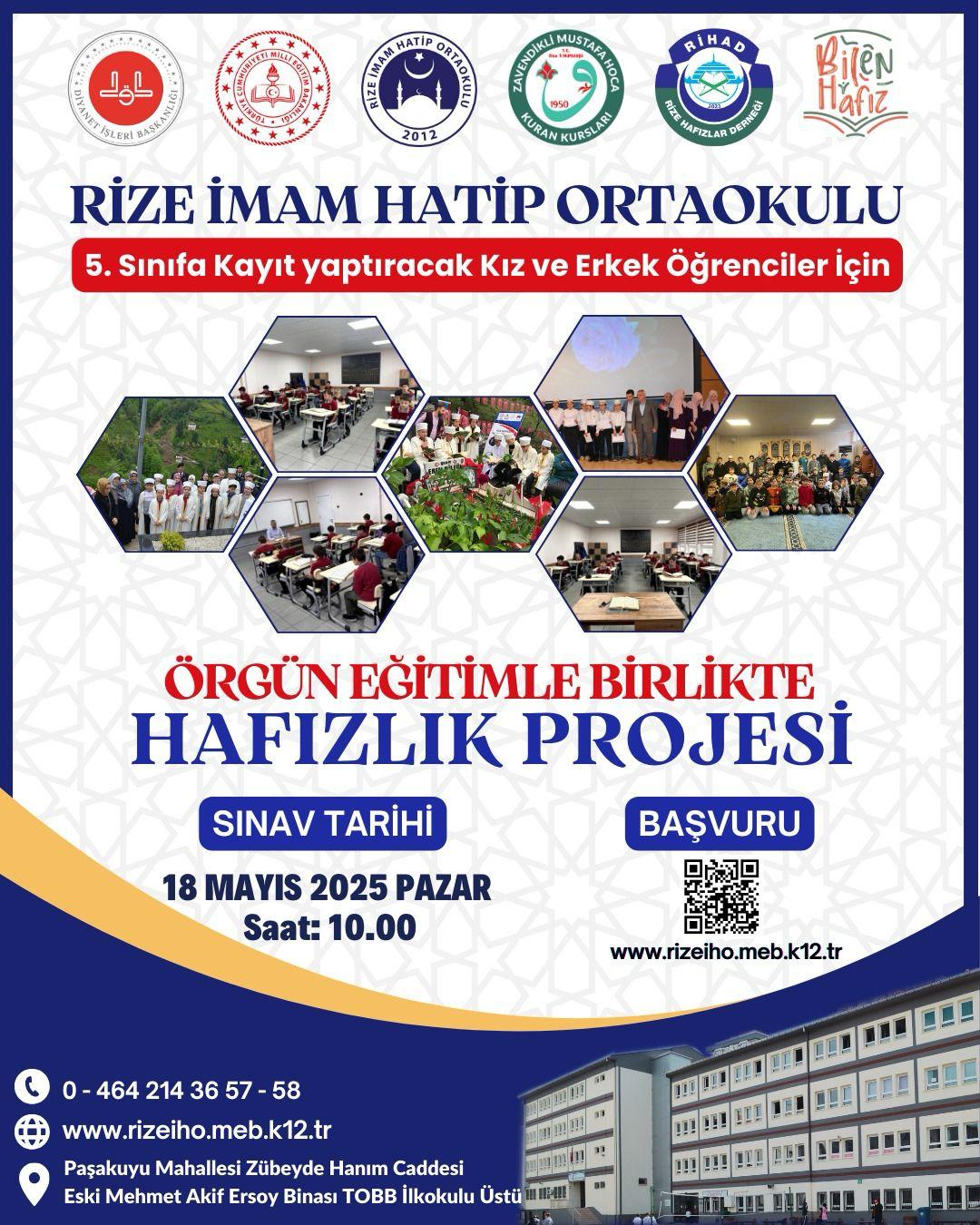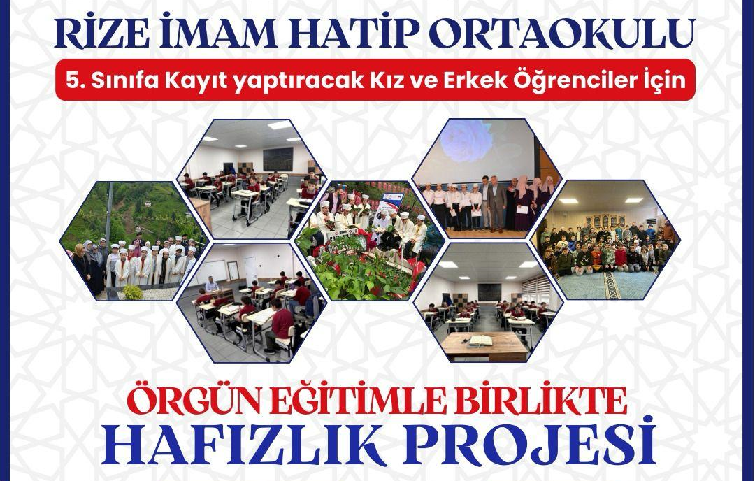 Rize İmam Hatip Ortaokulu, örgün eğitimle birlikte hafızlık yapmak isteyen 4. sınıfı bitirecek öğrenciler için "Örgün Eğitimle Birlikte Hafızlık Projesi” Programı’na öğrenci seçimi başvuruları başladı.